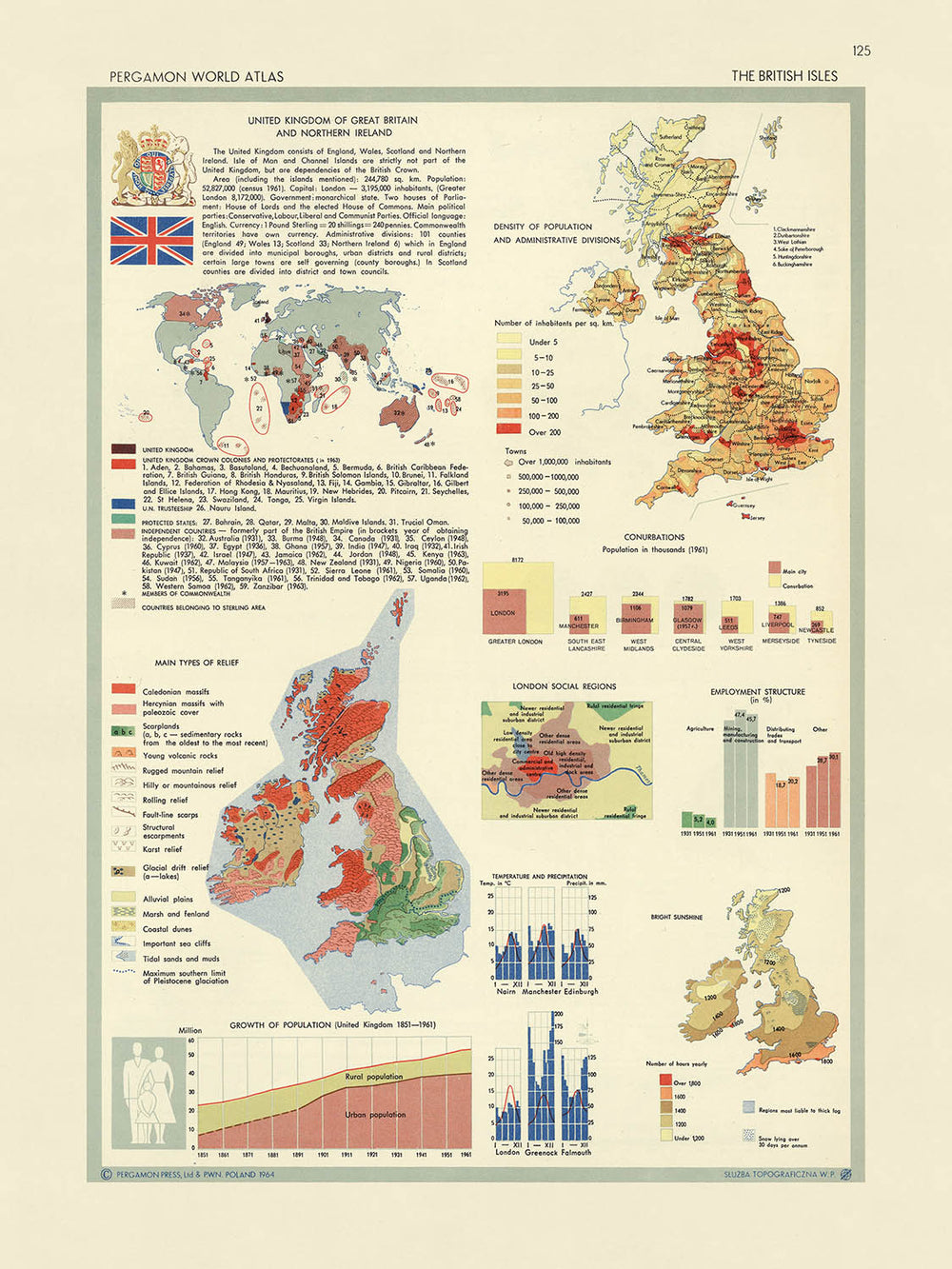 „British Isles in Infographics“ ist eine fesselnde visuelle Erzählung der Britischen Inseln, die 1967 vom Topografischen Dienst der polnischen Armee veröffentlicht wurde. Diese thematische Karte voller Informationen ist eine exquisite Darstellung der britischen Inseln und fasst den historischen Kontext dieser Zeit zusammen. Der Schwerpunkt der Karte liegt auf den Britischen Inseln, sie bietet jedoch auch eine breitere geografische Perspektive, was sie zu einer unschätzbaren Bereicherung für jeden Kartenliebhaber und Historiker macht. Die neun kleinen Karten und Grafiken, die in die Hauptkarte eingebettet sind, bieten ein umfassendes Verständnis des Vereinigten Königreichs, einschließlich Aspekten wie Bevölkerung, Reliefarten, Klima, Beschäftigung, Sonnenscheindauer und Bevölkerungsdichte.