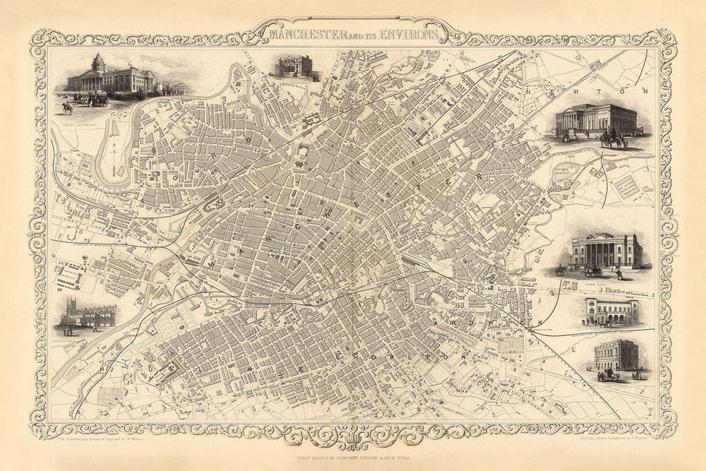 Gestochen von John Rapkin und veröffentlicht von J. Tallis & Co im Jahr 1851, ist dies eine der schönsten und detailliertesten historischen Karten von Manchester, die Sie aus der Blütezeit des industrialisierten viktorianischen Großbritanniens finden können.
