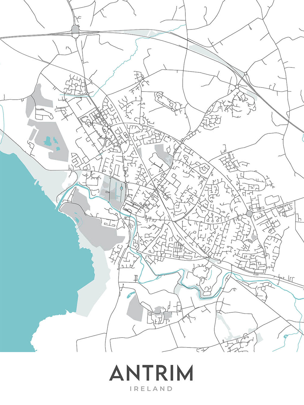 Diese Karte ist nicht nur ein Navigationshilfsmittel; sie ist ein Kunstwerk, das die Stadt Antrim auf eine neue und ansprechende Weise zum Leben erweckt. Ihre ästhetische Anziehungskraft liegt in ihrer Fähigkeit, einen geografischen Raum in ein visuell fesselndes Stück zu verwandeln, das eine Vielzahl von Einrichtungsstilen ergänzt. Die detaillierte Darstellung der Hauptstraßen wie Dublin Road, Ballymena Road und Greystone Road sowie markanter Sehenswürdigkeiten wie Antrim Castle Gardens und des Six Mile Water River verleiht dem Kunstwerk Tiefe und Charakter und macht es zu einem Gesprächsthema in jedem Raum.