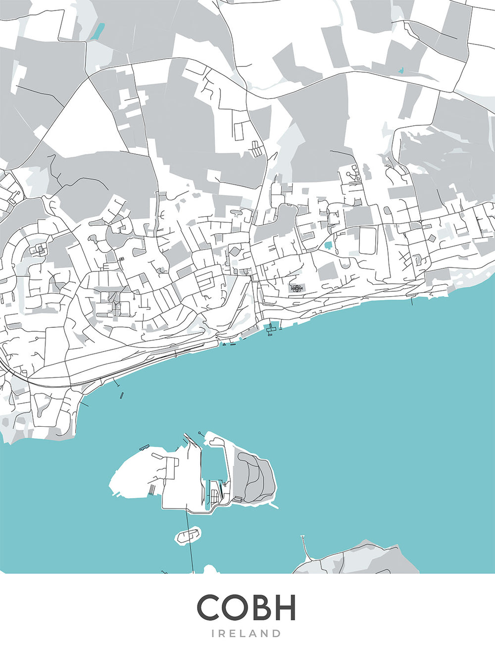 Diese Karte von Cobh, Irland, ist eine moderne, detaillierte Straßenkarte ohne Beschriftungen, die sich auf die Stadt und ihre umliegenden Gebiete konzentriert. Die Karte deckt ein rechteckiges Gebiet von ungefähr 2,88 Meilen mal 2,42 Meilen ab, mit der Stadt Cobh in der Mitte. Die Karte ist eine Originalkreation von The Unique Maps Co. und zeichnet sich durch einzigartige Kartografie, modernes Design und einzigartige Farbgebungen aus, die jedes Zuhause oder Büro ergänzen.