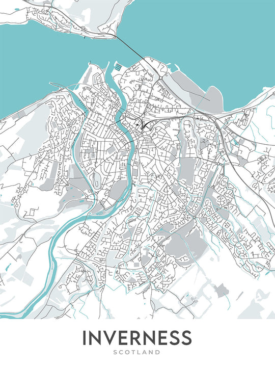 Über seine ästhetische Anziehungskraft hinaus ist diese Karte eine subtile Anspielung auf die reichen kulturellen und natürlichen Sehenswürdigkeiten von Inverness. Von der ikonischen Burg Inverness und dem ruhigen Fluss Ness bis zu den üppigen Weiten der Ness Islands und dem historischen Caledonian Canal – die Karte zeigt die beliebtesten Merkmale der Stadt. Diese Sehenswürdigkeiten sind zwar nicht explizit gekennzeichnet, werden aber durch die detaillierten Straßenmuster subtil angedeutet und bieten Kennern der Stadt ein vielschichtiges Erlebnis.