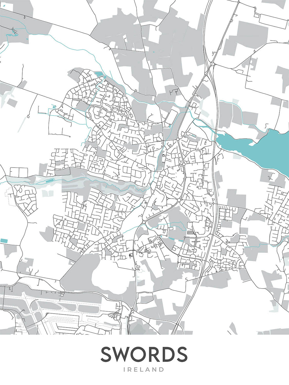 Moderne Stadtkarte von Swords, Irland: Schloss Swords, Schloss Malahide, Donabate Strand, Portrane Strand, Rush Strand