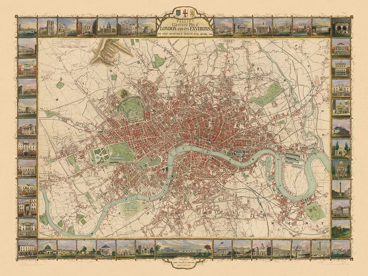 Seltene alte illustrierte Karte von London von Tallis, 1851 mit 50 Stadtansichten