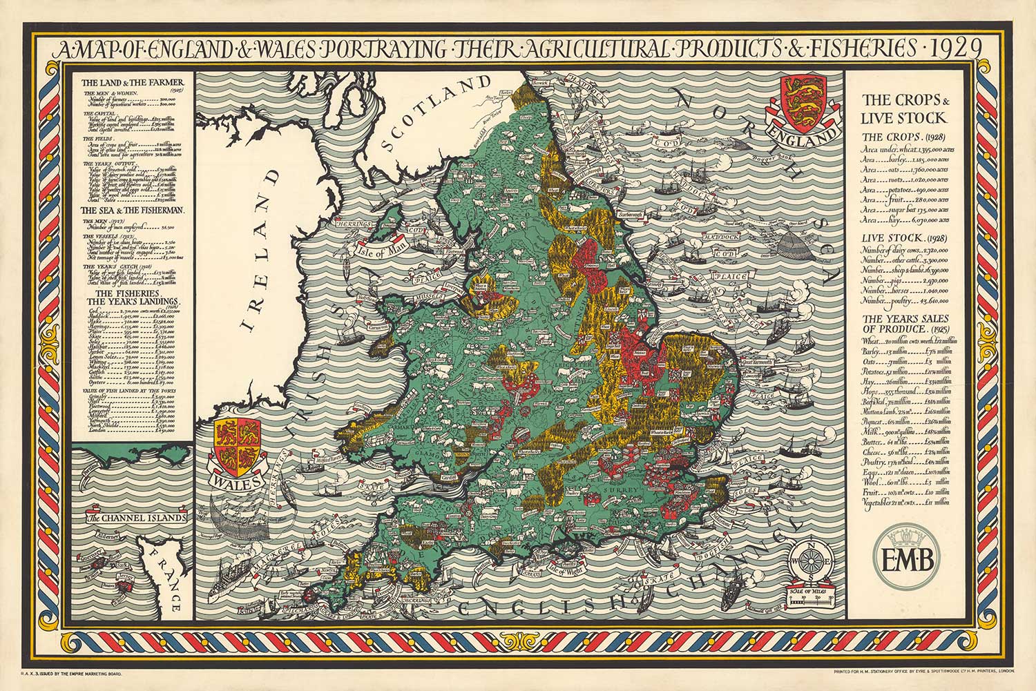 Diese Karte der Britischen Inseln hebt die landwirtschaftliche Produktion von England und Wales zu Beginn des 20. Jahrhunderts hervor. Die Hauptprodukte jeder Region sind um die Karte herum beschriftet, von Butter in Pembrokeshire bis Geflügel in Surrey. Die Karte wurde kurz nach der Großen Depression der britischen Landwirtschaft aufgrund von Übersee-Konkurrenz erstellt, was zu einem dramatischen Rückgang der Getreidepreise führte.