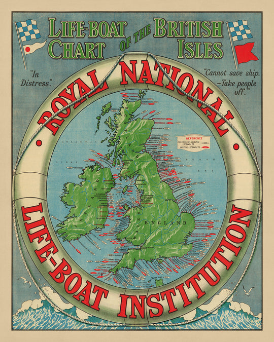 Besonders hervorzuheben ist, dass die „Rettungsbootkarte der Britischen Inseln“ mehr als eine geografische Darstellung ist; sie ist ein historisches Dokument, das einen Moment festhält, in dem die lebensrettenden Operationen der RNLI für die Schifffahrt und Sicherheit auf See von entscheidender Bedeutung waren. Die Referenztabelle und die Notizen, darunter ergreifende Botschaften wie „In Seenot“ und „Schiff kann nicht gerettet werden – Menschen herausholen“, geben Einblick in die Herausforderungen, denen sich Seeleute gegenübersahen, und die heldenhaften Anstrengungen der Rettungsbootbesatzungen, diese zu überwinden. Diese Karte bietet eine einzigartige Perspektive auf die technologischen und betrieblichen Aspekte von Rettungsbootstationen in der Mitte des 20. Jahrhunderts.