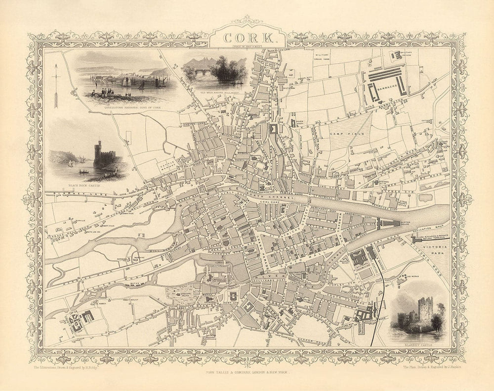 Rund um die Ränder der Karte befinden sich detaillierte Gravuren von bedeutenden Gebäuden und Wahrzeichen in Cork, darunter das Black Rock Castle und das Blarney Castle.