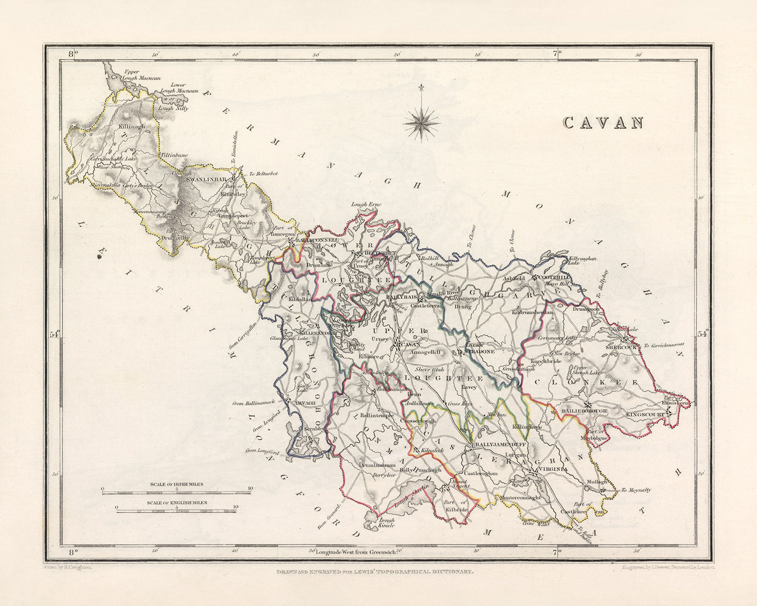 Alte Karte des County Cavan von Samuel Lewis, 1844: Belturbet, Cootehill, Bailieborough, Virginia und mehr
