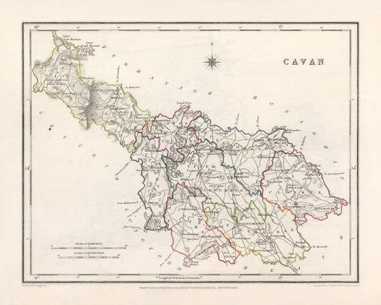 Diese exquisite alte Karte der Grafschaft Cavan, Irland, erstellt von Samuel Lewis im Jahr 1844, bietet einen fesselnden Einblick in die historische Landschaft dieser Region. Mit ihren komplizierten Details und dem eleganten kartografischen Stil ist diese Karte ein wahres Sammlerstück für Geschichtsinteressierte und Kartenliebhaber gleichermaßen.