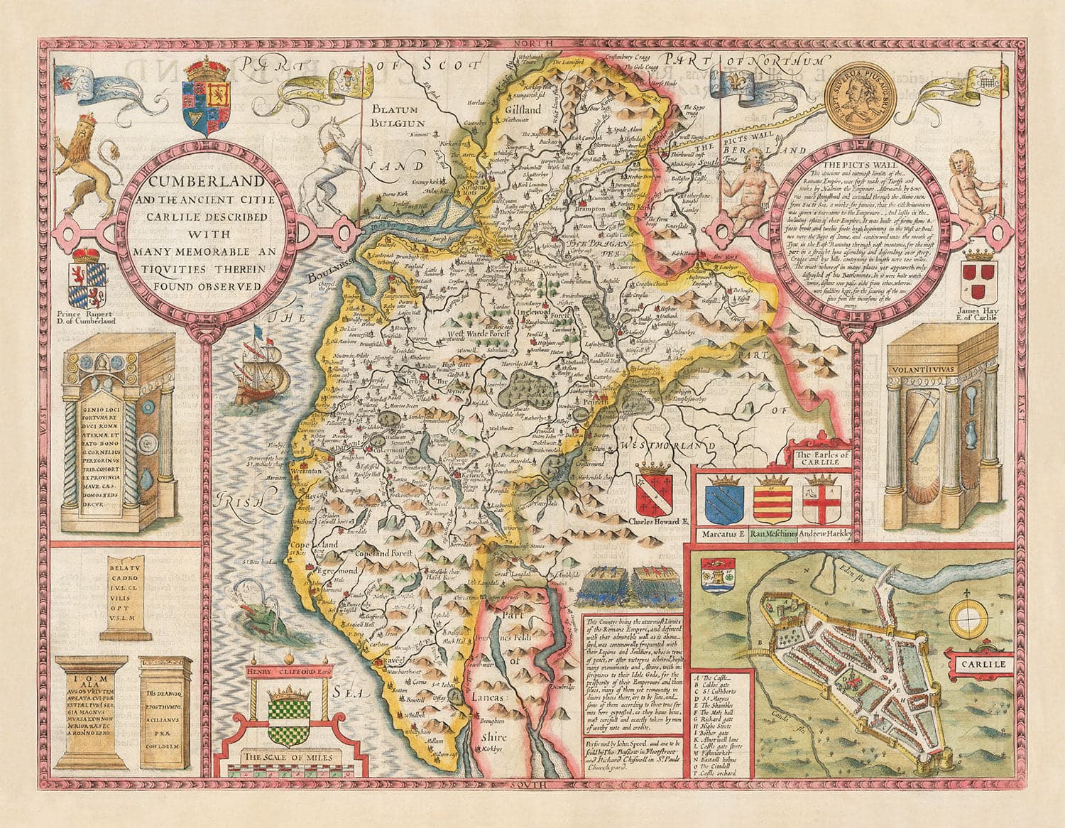 Eine detaillierte Gravur von Carlisle, der Grafschaftsstadt, befindet sich in der unteren rechten Ecke der Karte.