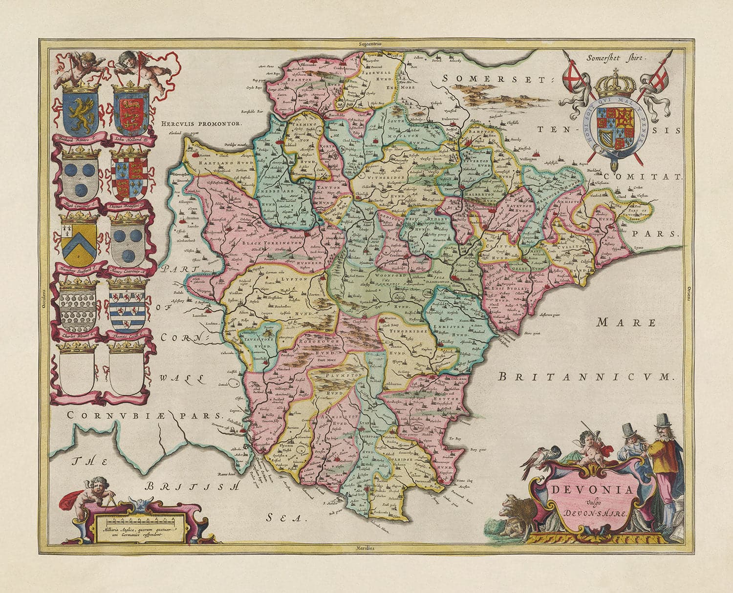 Alte Karte von Devon im Jahr 1665 von Joan Blaeu: Plymouth, Exeter, Torquay, Paignton, Exmouth, Barnstaple, West Country
