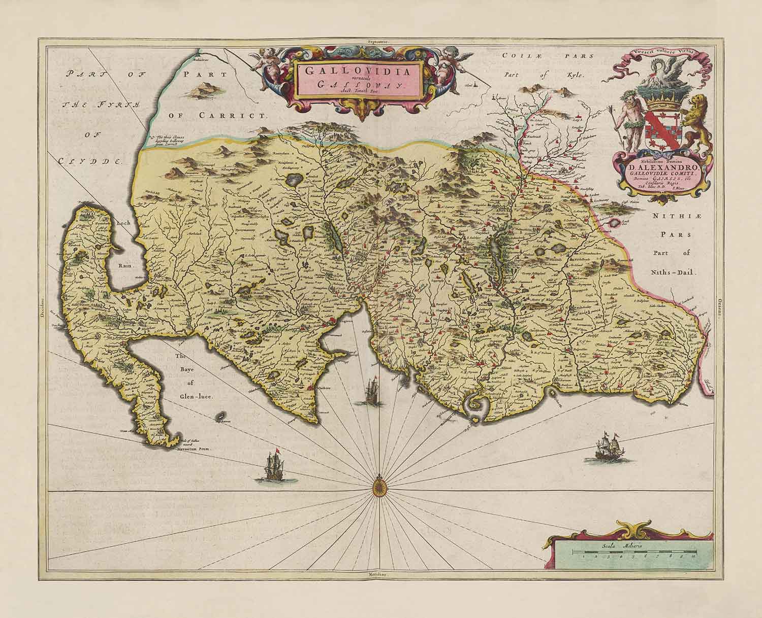 Diese äußerst seltene, alte Farbkarten von Galloway in Schottland und einem Teil des Landkreises Dumfries & Galloway wurde von dem Meisterkartenmacher Joan Blaeu aus seiner Werkstatt in Amsterdam erstellt und ursprünglich 1665 als Teil seines Theatrum Orbis Terrarum Sive Atlas Novus veröffentlicht.