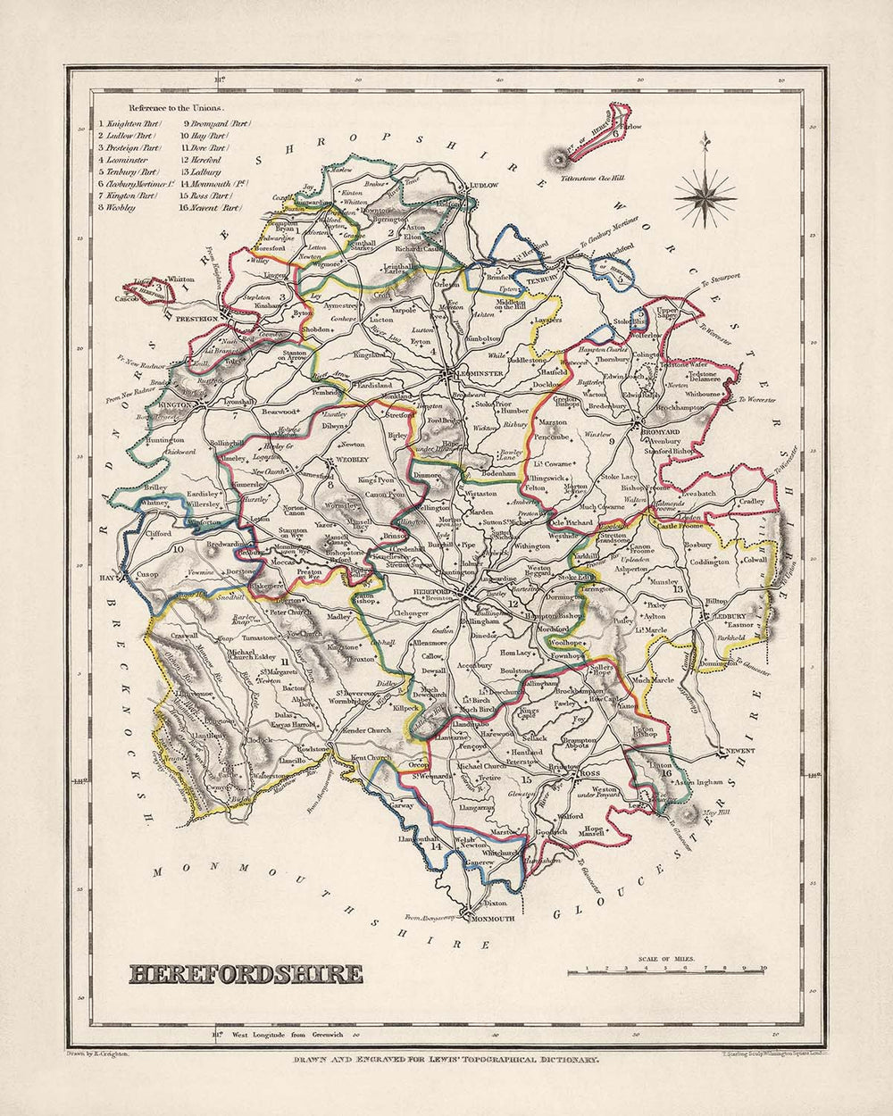 Diese alte Karte von Herefordshire von Samuel Lewis aus dem Jahr 1844 bietet einen faszinierenden Einblick in die historische Landschaft der Grafschaft. Mit ihren aufwendigen Details und ihrer exquisiten Handwerkskunst ist diese Karte ein wahres Sammlerstück für Geschichtsinteressierte und Kartografieliebhaber gleichermaßen.