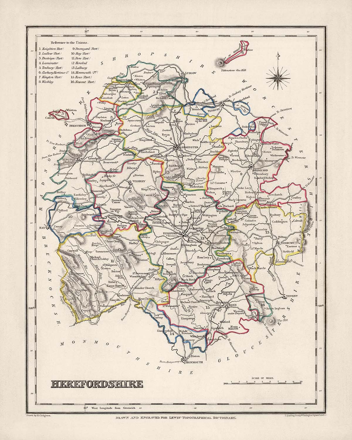 Alte Karte von Herefordshire von Samuel Lewis, 1844: Ledbury, Leominster, Ross-on-Wye, Bromyard, Hay-on-Wye