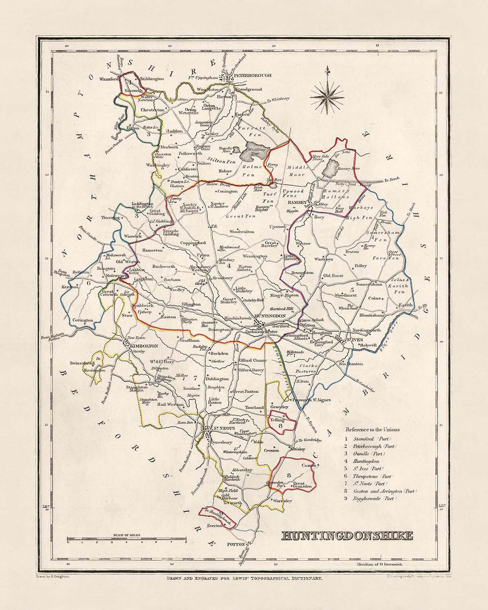 Wenn Sie diese alte Karte von Huntingdonshire von Samuel Lewis aus dem Jahr 1844 besitzen, können Sie in die Vergangenheit der Grafschaft eintauchen, ihre historischen Siedlungen erkunden und die natürliche Schönheit schätzen, die über die Jahrhunderte hinweg erhalten geblieben ist. Es ist ein bemerkenswertes Stück Geschichte, das zweifellos jede Sammlung bereichert oder als einzigartiges Dekorationsstück dient.