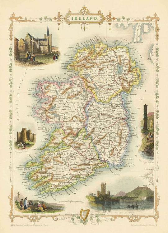 Graviert von John Rapkin und veröffentlicht von J. Tallis & Co im Jahr 1851, und hier mit seiner originalen 150 Jahre alten Handkolorierung präsentiert, ist dies eine der feinsten und detailliertesten historischen Karten von Irland.