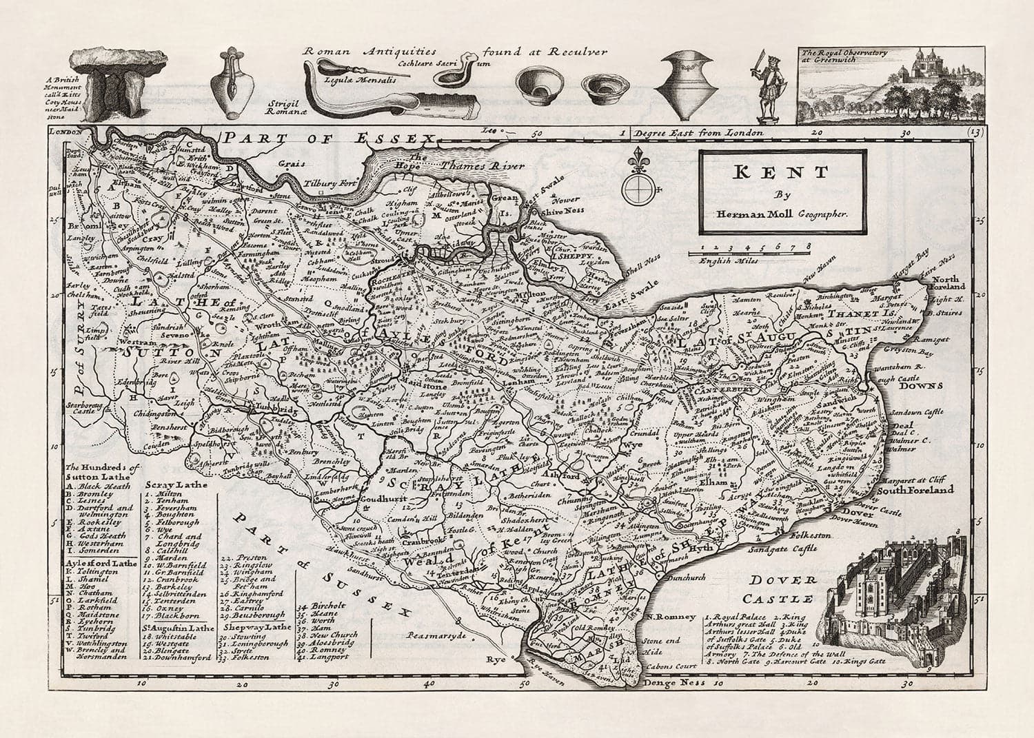 Moll's County Maps sind mit interessanten Ansichten und Kuriositäten geschmückt - in diesem Fall ist in diesem Fall eine detaillierte Gravur von Dover Castle unten rechts, einige römische Antiquitäten, anschließend in Reculver und eine schöne Skizze des Greenwich-Observatoriums gefunden.