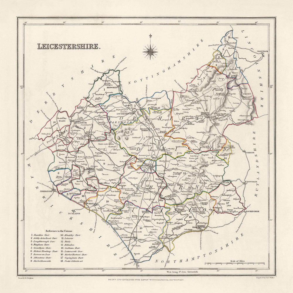 Alte Karte von Leicestershire von Samuel Lewis, 1844: Leicester, Melton Mowbray, Loughborough, Hinckley, Ashby-de-la-Zouch