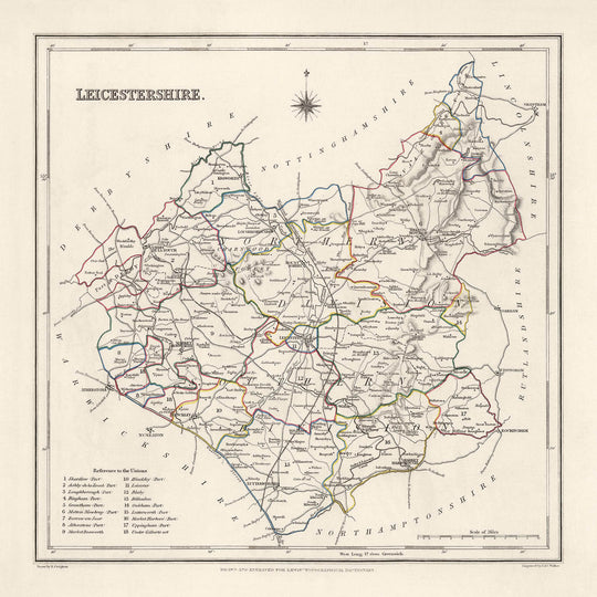 Diese alte Karte von Leicestershire von Samuel Lewis aus dem Jahr 1844 zeigt die historischen Grenzen der Grafschaft und bietet einen faszinierenden Einblick in die Vergangenheit. Mit ihren aufwendigen Details und ihrer exquisiten kartografischen Handwerkskunst bietet diese Karte eine einzigartige Gelegenheit, die Region in ihrem Zustand vor über 175 Jahren zu erkunden.