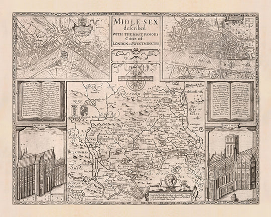 Diese wunderschön detaillierte Karte von Middlesex von John Speed aus dem Jahr 1676 zeigt die Grafschaft zu einer Zeit, als sie noch weitgehend ländlich geprägt war und es nur eine Handvoll größerer Siedlungen gab. Die Karte zeigt, wie sich die Themse durch die Grafschaft schlängelt, wobei London, Westminster, Highgate, Harrow, Brentford und Uxbridge deutlich markiert sind. Weitere bemerkenswerte Sehenswürdigkeiten sind Enfield Chase, ein riesiger königlicher Jagdwald, und Hampstead Heath, ein beliebter Ort für Londoner, um der Stadt zu entfliehen.