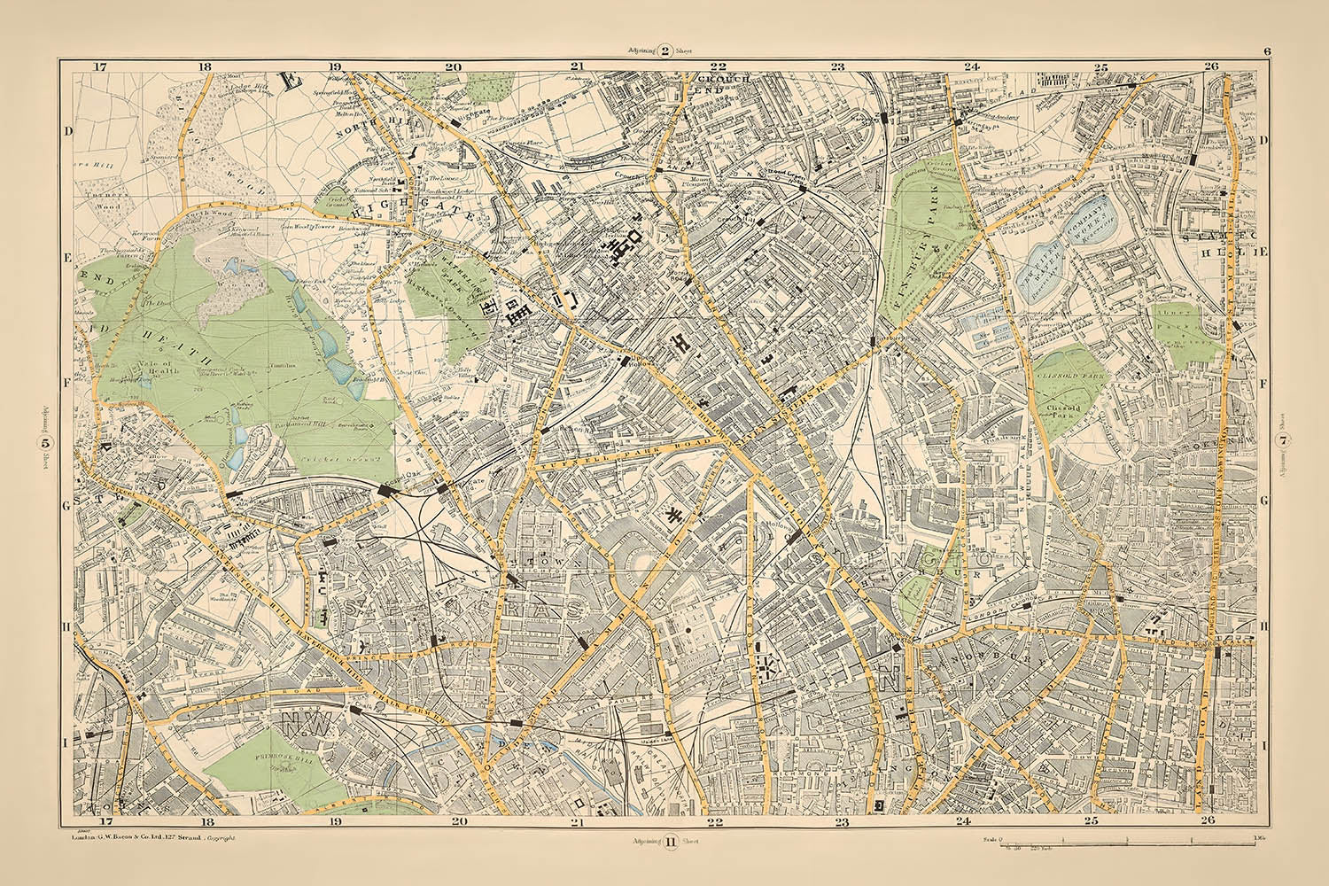 Blatt 6 aus Bacons Neuem Großmaßstab-Atlas von London und den Vororten, erstellt im Jahr 1900, bietet einen faszinierenden Einblick in Nord-Zentral-London während einer entscheidenden Ära des Wandels. Diese Karte fängt das zarte Gleichgewicht zwischen den weitläufigen viktorianischen Wahrzeichen und den Überresten von ländlichem Ackerland ein. Während Sie ihre Feinheiten erkunden, werden Sie die harmonische Koexistenz von urbaner Entwicklung und natürlicher Schönheit entdecken, wobei Gebiete wie Hampstead Heath und Finsbury Park üppige Zufluchtsorte inmitten der städtischen Expansion bieten.