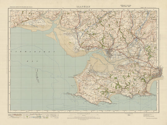 Diese Old Ordnance Survey Map, Blatt 100 – Llanelly, 1925, bietet mit ihrer detaillierten Darstellung der Region Llanelly in England und Wales einen faszinierenden Einblick in die Vergangenheit. Die Karte zeigt mehrere Städte und interessante Merkmale, darunter Swansea, Mumbles, Burry Port, Kidwelly und die Gower Area of Outstanding Natural Beauty (AONB).