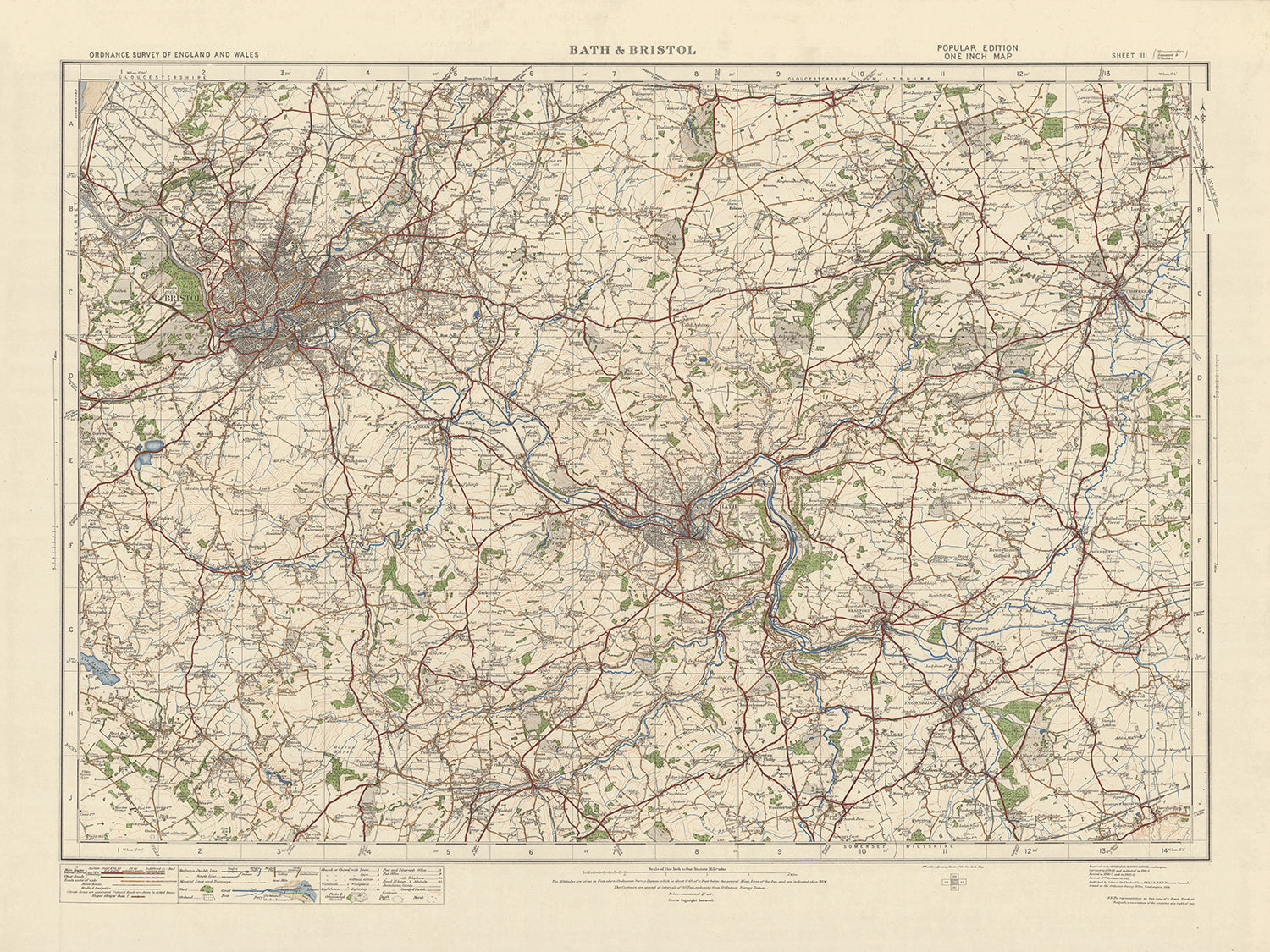 Diese alte Ordnance Survey-Karte, Blatt 111 – Bath & Bristol, wurde 1925 als Teil der One-Zoll-„Popular“-Ausgabe für England und Wales veröffentlicht. Die Karte zeigt die historische Grafschaft Somerset, in der sich die bedeutenden Städte Bath und Bristol befinden. Zusätzlich zu diesen prominenten Städten umfasst die Karte auch die Städte Chippenham, Trowbridge, Corsham, Melksham und das malerische Cotswolds Area of Outstanding Natural Beauty (AONB).