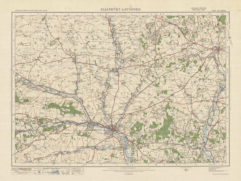 Die Karte „Blatt 122 – Salisbury & Bulford“ aus der 1-Zoll-Ausgabe „Popular“ von Ordnance Survey, England und Wales, veröffentlicht 1925, ist ein fesselndes Stück Geschichte, das einen detaillierten Überblick über die Region Salisbury und Bulford während dieser Zeit bietet. Diese sorgfältig gestaltete Karte zeigt die Städte und interessanten Merkmale der Region, darunter Andover, Amesbury, Wilton, Stockbridge und das Cranborne Chase Area of Outstanding Natural Beauty (AONB).