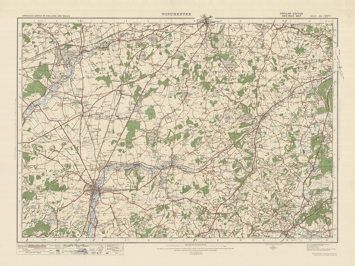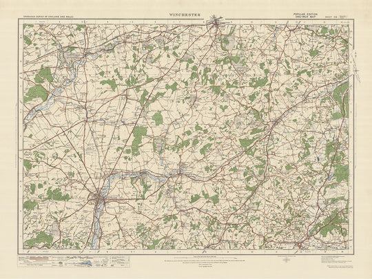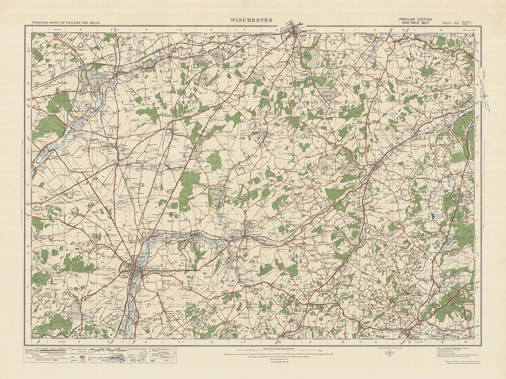 Diese Vintage-Karte mit dem Titel „Blatt 123 – Winchester“ ist Teil der 1 Zoll großen „Popular“-Ausgabe des Ordnance Survey für England und Wales, die 1925 veröffentlicht wurde. Die Karte zeigt die historische Stadt Winchester sowie mehrere andere Städte und interessante Sehenswürdigkeiten in der Umgebung. Es bietet einen faszinierenden Einblick in die Landschaft, Siedlungen und Grenzen der Region im frühen 20. Jahrhundert.