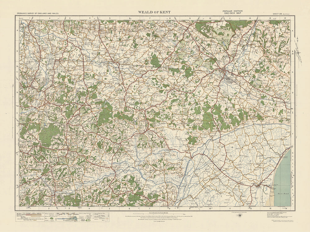 Die Karte „Blatt 126 – Weald of Kent“ aus der One-Zoll-Ausgabe „Popular“ von Ordnance Survey, England und Wales, veröffentlicht 1925, ist ein faszinierendes Stück kartografischer Geschichte. Diese sorgfältig erstellte Karte bietet eine detaillierte Momentaufnahme der Region Weald of Kent im frühen 20. Jahrhundert. Der Produkttitel fängt das Wesentliche dieser Karte treffend ein, hebt ihre historische Bedeutung hervor und stellt einige der darauf abgebildeten Großstädte und interessanten Merkmale vor.