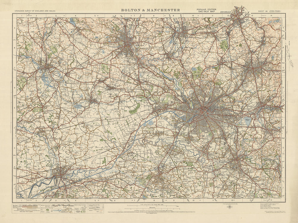 Die Old Ordnance Survey Map, Blatt 36 – Bolton & Manchester, 1925 ist ein bemerkenswertes Stück kartografischer Geschichte, das einen faszinierenden Einblick in die Vergangenheit bietet. Diese Karte, Teil der One-Zoll-Ausgabe „Popular“ für England und Wales, zeigt die Städte Bolton und Manchester sowie mehrere andere bedeutende Siedlungen und Merkmale in der Umgebung.