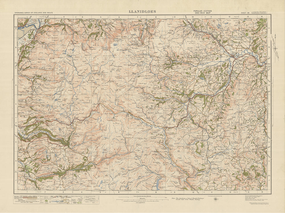 Diese faszinierende alte Karte mit dem Titel „Blatt 69 – Llanidloes“ ist Teil der 1-Zoll-Ausgabe „Popular“ des Ordnance Survey für England und Wales, die 1925 veröffentlicht wurde. Die Karte zeigt die historische Grafschaft Montgomeryshire, in der sich die Stadt Llanidloes befindet gelegen. Llanidloes, eine charmante Marktstadt, ist der zentrale Sehenswürdigkeit auf dieser Karte. Es ist jedoch nicht der einzige bemerkenswerte abgebildete Ort. Die Karte zeigt außerdem mehrere andere Städte und bemerkenswerte Merkmale, die sie zu einem wertvollen Stück für Geschichtsinteressierte und Kartografieliebhaber gleichermaßen machen.