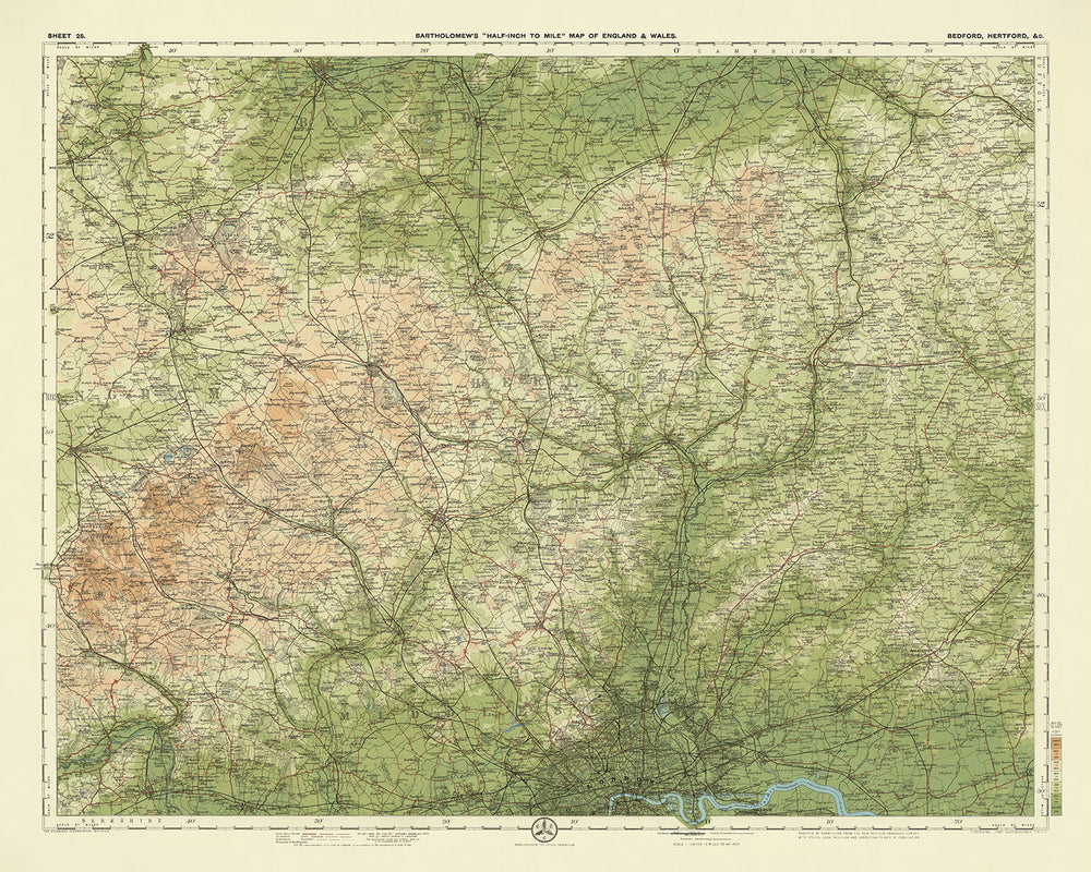 Das Design der Karte ist ein Wunder kartografischer Innovation und verwendet eine subtile Abstufung von Farbbanden, um das Landschaftsrelief darzustellen. Diese Technik, die für Bartholomews Karten charakteristisch ist, ermöglicht ein nuanciertes Verständnis des Geländes und hebt die sanften Hügel und Täler hervor, die die Region prägen. Die Chiltern Hills, ein herausragendes Merkmal der Karte, werden mit einem sanften, aber präzisen Touch dargestellt und laden den Betrachter ein, die natürliche Schönheit des Gebiets zu erkunden. Die sorgfältige Schichtung der Farben verbessert nicht nur die visuelle Anziehungskraft der Karte, sondern bietet auch einen praktischen Leitfaden zur Navigation durch die vielfältigen Landschaften von Bedfordshire und Hertfordshire.