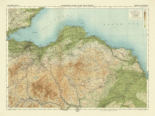 Tauchen Sie ein in das reiche Gewebe der Kartographie des frühen 20. Jahrhunderts mit "Blatt 9 - Berwick & Haddington", einem meisterhaften Werk des renommierten schottischen Kartografen JG Bartholomew. Diese Karte, die 1901 erstellt wurde, ist ein Zeugnis für Bartholomews unvergleichliche Fähigkeiten und seinen innovativen Ansatz beim Kartieren. Bekannt für seine detaillierten und ästhetisch ansprechenden Karten, wurde Bartholomews Arbeit von Touristen und Radfahrern gleichermaßen hoch geschätzt. Diese spezielle Karte zeichnet sich durch ihre akribische Darstellung der politischen und physischen Landschaft von Berwickshire und Haddingtonshire aus, Regionen, die reich an Geschichte und natürlicher Schönheit sind.