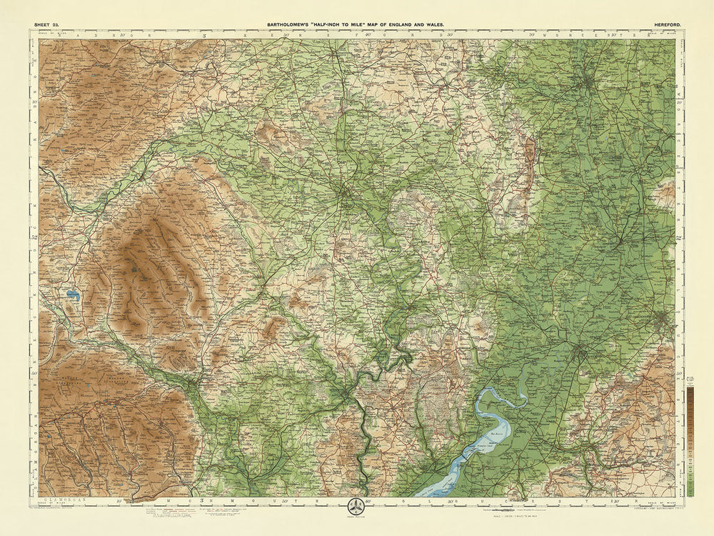 "Blatt 23 - Hereford," erstellt von dem angesehenen Kartografen JG Bartholomew im Jahr 1901, ist ein Meisterwerk der frühen Kartografie des 20. Jahrhunderts. Bartholomew, bekannt für seine innovativen und detaillierten Karten, entwarf diese Karte im Maßstab von einer halben Zoll pro Meile (1:126.720) mit Radfahrern und Touristen im Hinterkopf. Die Klarheit, Attraktivität und lebendigen Farben der Karte machten sie zu einer Flaggschiff-Serie für Bartholomew, und sie bleibt ein geschätztes Stück für Sammler und Geschichtsinteressierte. Diese besondere Karte bietet eine detaillierte politische und physische Darstellung von Herefordshire und den umliegenden Regionen und gewährt einen Einblick in die Landschaft und Infrastruktur der Britischen Inseln vor über einem Jahrhundert.