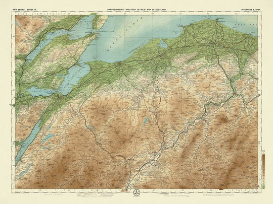Die Karte umfasst eine Vielzahl von geografischen Merkmalen, von den ruhigen Gewässern von Loch Ness und Loch Morlich bis hin zu den fließenden Flüssen wie dem River Spey und dem River Ness. Die Küstenschönheit des Moray Firth und des Cromarty Firth wird ebenfalls deutlich dargestellt und lädt den Betrachter ein, die komplizierten Details der Naturlandschaften Schottlands zu erkunden. Das Design der Karte ist nicht nur ein optischer Genuss, sondern auch ein praktischer Leitfaden, der das wachsende Interesse an Outdoor-Aktivitäten und Tourismus im frühen 20. Jahrhundert widerspiegelt.