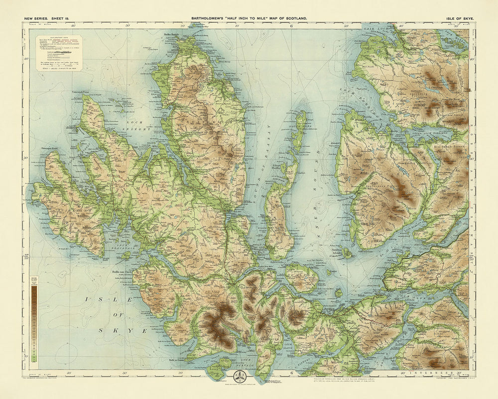 Das Design der Karte ist ein Wunderwerk kartografischer Kunst und verwendet einen Maßstab von einer halben Zoll pro Meile (1:126.720), der einen detaillierten und umfassenden Blick auf die Isle of Skye und ihre Umgebung bietet. Bartholomews Verwendung von Farbverläufen zur Darstellung des Landschaftsreliefs ist besonders bemerkenswert und zeigt verschiedene Höhenlagen mit subtilen und innovativen Farbbändern. Diese Technik verbessert nicht nur die ästhetische Anziehungskraft der Karte, sondern bietet auch ein klares und intuitives Verständnis des Geländes, was sie zu einem unverzichtbaren Werkzeug für Radfahrer und Touristen der damaligen Zeit macht.