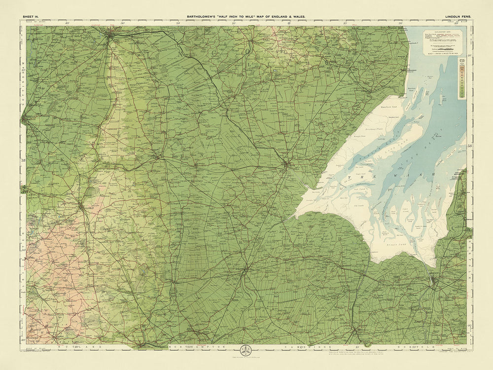 Die Karte ist reich an bemerkenswerten Merkmalen, einschließlich des Flusses Witham, des Flusses Welland und der Fossdyke-Navigation, die eine entscheidende Rolle in der Geschichte und Entwicklung der Region gespielt haben. Die Wash, eine große Mündung, wird prominent dargestellt, zusammen mit ihren Sand- und Kiesbänken und den umliegenden Salzmarschen. Diese natürlichen Phänomene sind akribisch detailliert, was Bartholomews Engagement für Genauigkeit und sein tiefes Verständnis der Landschaft widerspiegelt. Die Karte zeigt auch antike römische Infrastruktur, wie den Car Dyke, und fügt eine historische Tiefe hinzu.