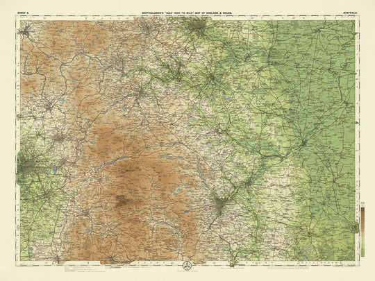 Bartholomews Blatt 9 - Sheffield ist nicht nur eine Karte; es ist ein historisches Dokument, das einen Blick in die Vergangenheit bietet. Es fängt das Wesen der Geographie der Region ein, von den sanften Hügeln und üppigen Tälern bis zu den pulsierenden Städten und ruhigen Flüssen. Diese Karte ist eine Feier des reichen Wandteppichs aus natürlicher und menschlicher Geschichte, der Zentral- und Nordengland definiert, und macht sie zu einer wertvollen Ergänzung jeder Sammlung historischer Karten.
