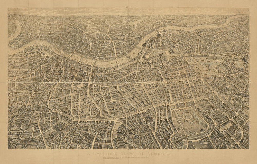 Diese Karte aus dem Jahr 1851 mit dem Titel „Eine Ballonansicht von London (von Hampstead aus gesehen)“ bietet eine einzigartige Perspektive der Stadt, als würde sie von einem Heißluftballon aus betrachtet, der über Hampstead Heath schwebt. Dieser bemerkenswerte Aussichtspunkt bietet einen unvergleichlichen Blick auf die Stadtlandschaft Londons in einer Zeit schnellen Wachstums und Wandels.