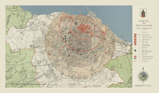 Edinburgh, eine Stadt, die für ihre reiche Geschichte und kulturelle Bedeutung bekannt ist, wird in dieser Karte wunderschön dargestellt, wobei Viertel wie Cramond, Portobello und Craigmillar hervorgehoben werden. Diese Gebiete, jedes mit ihrem eigenen charakteristischen Wesen, zeigen die vielfältigen Bildungsangebote, die den Bewohnern zu dieser Zeit zur Verfügung standen. Das Design der Karte, das konzentrische Kreise zeigt, illustriert elegant die Zugänglichkeit dieser Institutionen vom Stadtzentrum aus und unterstreicht die durchdachte Planung, die Abercrombies Arbeit prägte.