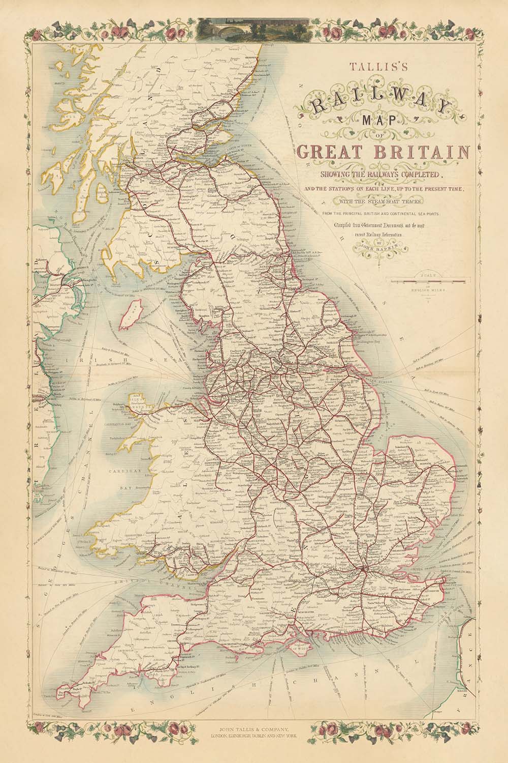 John Tallis, bekannt für seine eleganten und dekorativen kartografischen Werke, verlieh dieser Karte ein Gefühl von Größe und Klarheit. In Zusammenarbeit mit John Rapkin, dessen akribisches Gravieren die Details zum Leben erweckte, stellte Tallis sicher, dass jede Linie und Station nicht nur genau – mühsam aus Regierungsdokumenten und den neuesten Eisenbahninformationen zusammengestellt – sondern auch visuell fesselnd war. Der kunstvolle Rahmen der Karte ist wunderschön.