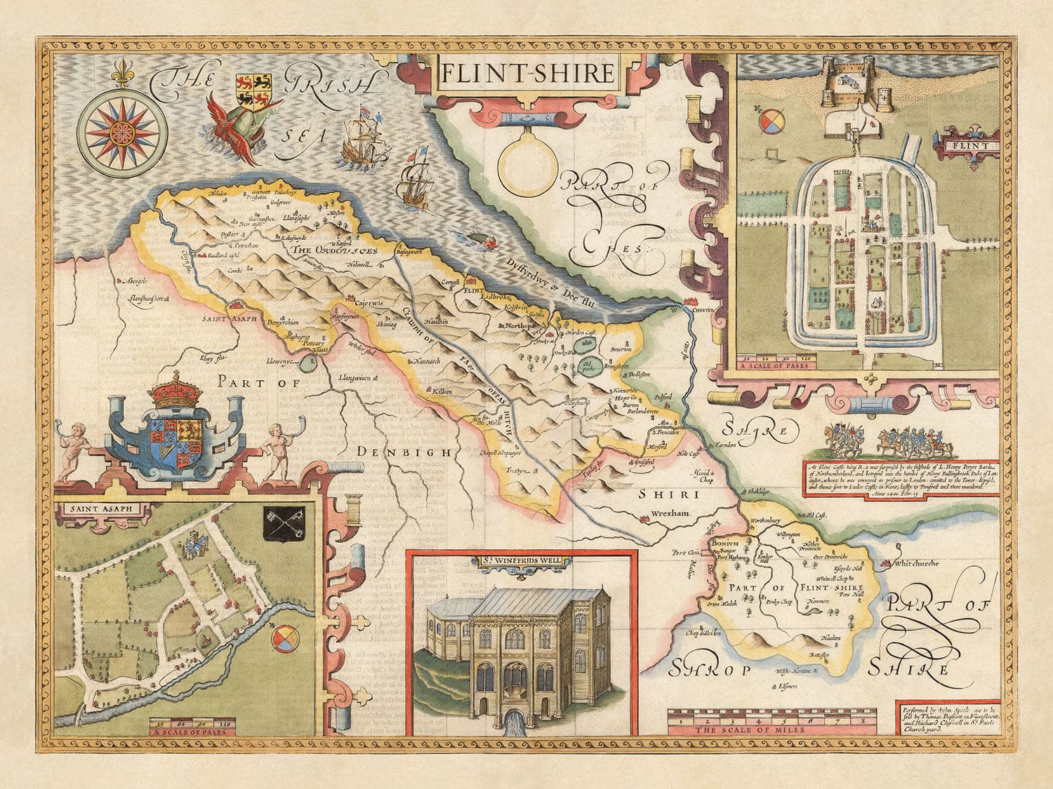 Oben rechts befindet sich eine detaillierte Gravur von Flint, der Grafschaftsstadt von Flintshire.