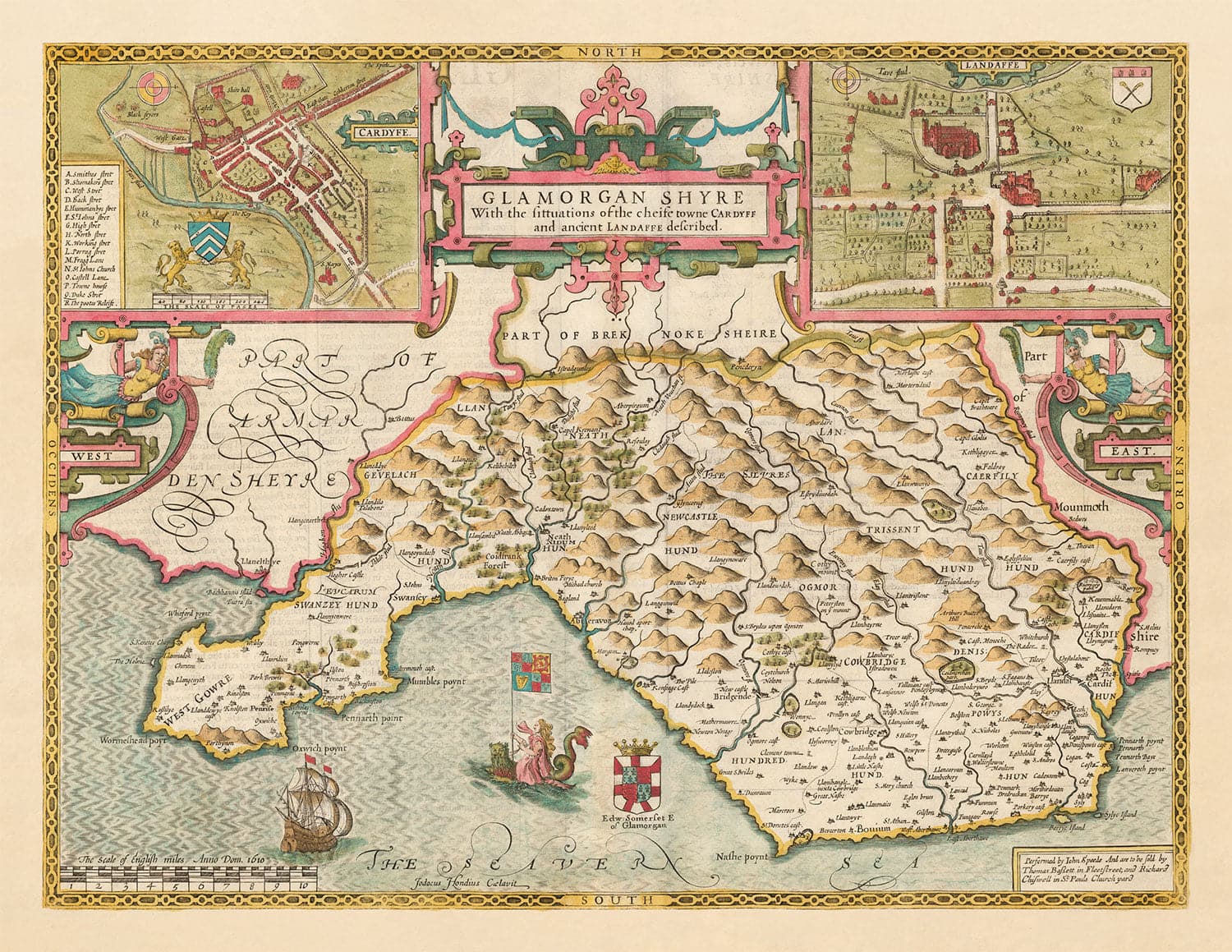 Alte Karte von Glamorgan Wales, 1611 von John Speed: Cardiff, Swansea, Bridgend, Port Talbot, Barry