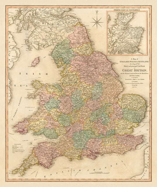 Alte Karte von Großbritannien, 1801 von Faden: England, Wales, Schottland, Straßen, Kanäle, Postkutsche