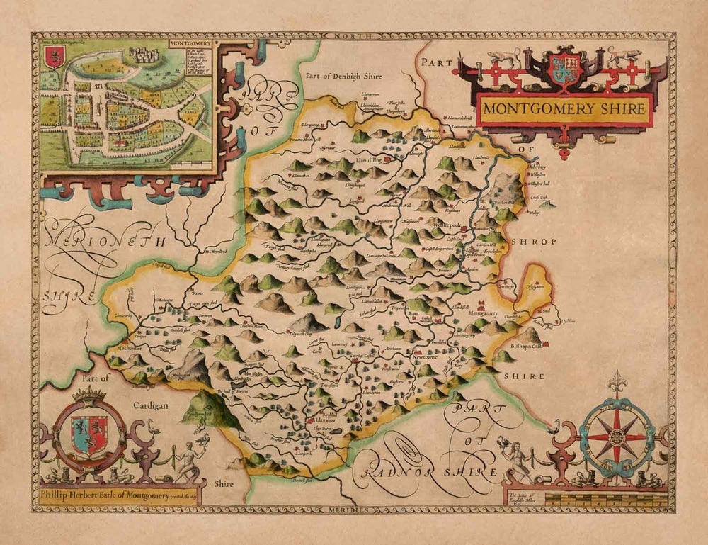 Alte Karte von Montgomeryshire, Wales, 1611 von John Speed: Powys, Maldwyn, Montgomery, Newtown, Welshpool, Llanidloes