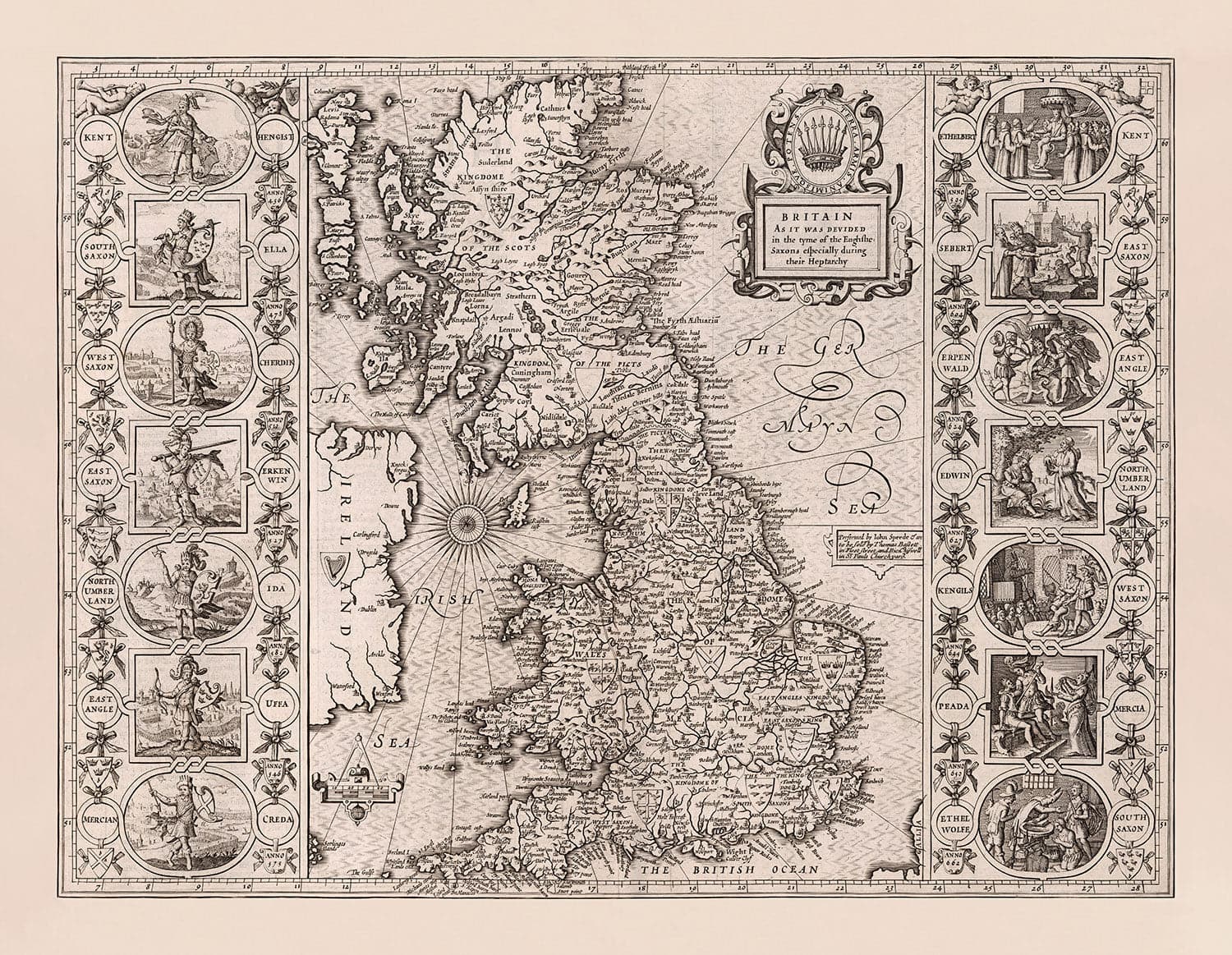 Diese alte, äußerst seltene monochrome Kupferstichkarte zeigt Großbritannien (England, Schottland, Wales) im 5. und 6. Jahrhundert n. Chr., als es von der Wikinger/Angelsächsischen "Heptarchie" - den sieben Königen - regiert wurde. Sie wurde von dem besten Kartografen des 17. Jahrhunderts, John Speed, erstellt, von Jodocus Hondius graviert und ursprünglich in Speeds "The Theatre of the Empire of Great Britaine" veröffentlicht - bis heute eine der besten Sammlungen von Karten des Vereinigten Königreichs.