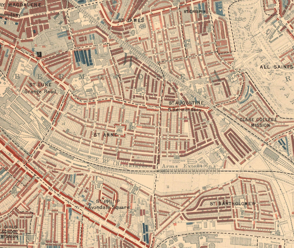 Karte der Londoner Armut 1898-9, Inneres Südliches, von Charles Booth: Southwark, Waterloo, London Bridge, Camberwell, Peckham, Bermondsey