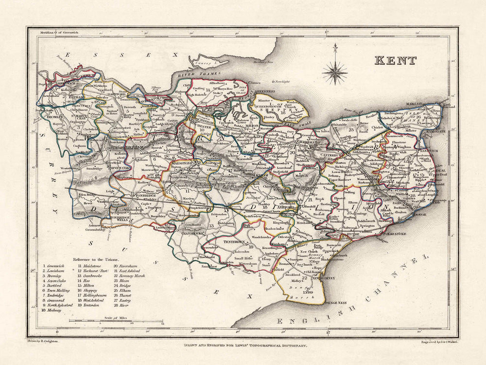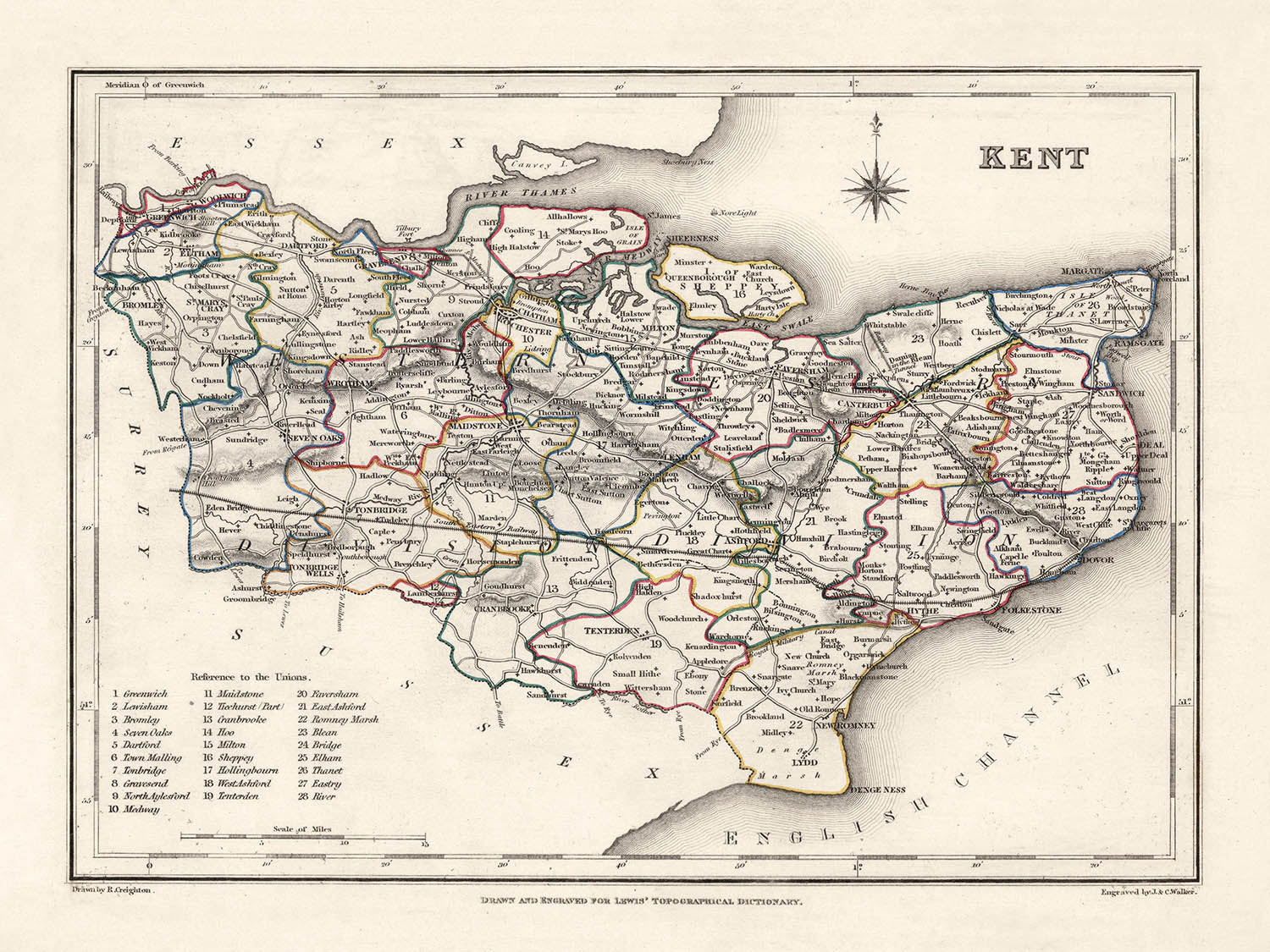 Entdecken Sie die historische Pracht von Kent durch Samuel Lewis' sorgfältig gestaltete Karte von 1844, ein Schatz für Geschichtsbegeisterte und Kartografie-Liebhaber. Diese antiquierte Darstellung eines der ältesten und einflussreichsten Grafschaften Englands fängt das Wesen der Vergangenheit ein und zeigt Siedlungen, die vor 1840 existierten, einschließlich vieler der heutigen pulsierenden Städte. So malt sie ein faszinierendes Bild einer Ära, in der einige der heute prominentesten Städte gerade entstanden oder, aufregenderweise, unter anderen Namen bekannt waren.
