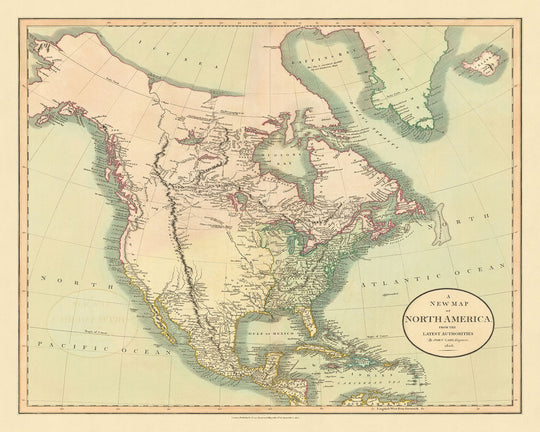 Die Karte ist reich an geografischen Merkmalen, einschließlich der komplexen Flusssysteme, die entscheidend für die Erkundung und Entwicklung des Kontinents waren. Von den majestätischen Rocky Mountains bis zu den ausgedehnten Küstenlinien entlang des Atlantiks und des Pazifiks skizziert Carys Karte die natürlichen Konturen, die die Schritte von Pionieren und Abenteurern leiten würden. Die Darstellung der Flusssysteme oberhalb der Pawnee-Dörfer am Missouri River, informiert durch Arrowsmiths Karte, hebt die Suche nach einem Durchgang über die Rockies zum Pazifik hervor. Dieses Maß an Detail bietet einen faszinierenden Einblick in die Herausforderungen, denen sich Entdecker gegenübersahen, und die Bedeutung der Flüsse für die Expansion der Nation.