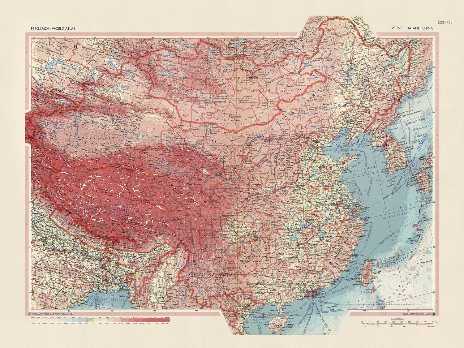 Alte Karte von Mongolei und China, 1967: Korea, Taiwan, Detailliertes politisches und physisches Atlas